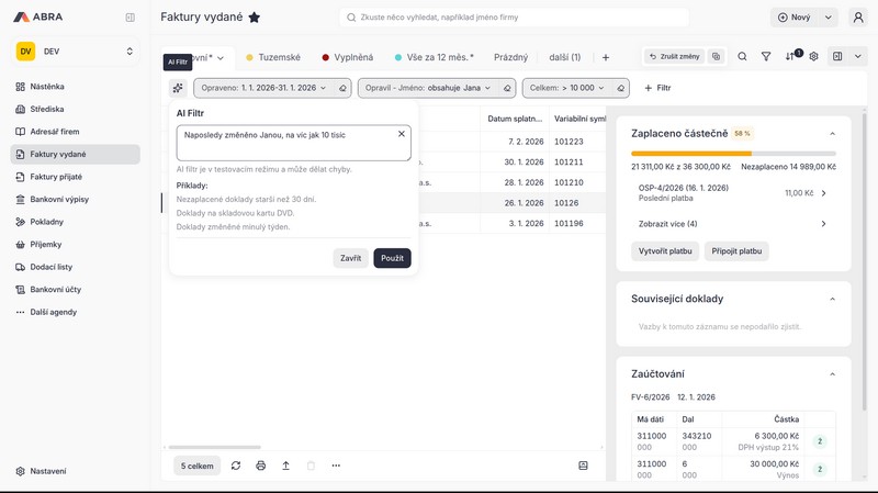 Při filtrování dat už díky AI nemusíte zdlouhavě vyhledávat různá kritéria pro omezení. AI dokáže pracovat s otázkou v přirozeném jazyce a na základě ní připravit systémové filtrační „čipy“, které odpovídají kritériím pro vyhledávání. Tato funkce významné zjednoduší a zrychlí práci uživatelům webových verzí systémů ABRA Flexi i ABRA Gen.