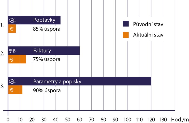 Výchozí stav: V segmentu HW komponent dochází k častým změnám cen, které je nutné průběžně aktualizovat v ERP systému. Týdně přijímáme více než 80 nabídek v různých formátech, bez jednotného datového feedu, proto bylo doposud nutné aktuální ceny do informačního systému zadávat ručně, což kolegům z nákupního oddělení zabralo v průměru dvě hodiny denně.