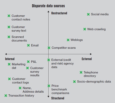 Data mohou být více nebo méně strukturovaná, interní nebo externí, neplacená nebo placená. Nejsnáze použitelná data jsou interní strukturovaná, na obrázku jsou v levém dolním kvadrantu. Současné technologie a trh s daty ale posouvají hranice použitelného čím dál tím více doleva a nahoru, například k využití skenovaných dokumentů nebo textů publikovaných na internetu.