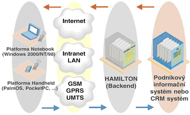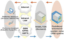 Hamilton SFA tvoří dvě základní části: · Frontend - nástroj pro obchodní zástupce tvoří multiplatformová aplikace vytvořená pro Windows XP/2000, Mobile Windows (Pocket PC), Windows CE a PalmOS. · Backend - nástroj pro řízení obchodních zástupců a správu základních údajů. Umožňuje komplexně pracovat s údaji, které se nacházejí v databázi - od práce se zákazníky, produkty, cenami, vytváření různých reportů a přehledů, přípravu podkladů pro marketingové průzkumy, monitoring cen a distribuce až po administraci celého systému, jako vytvoření nových uživatelů apod. Funguje na platformě Windows a částečně Linux.