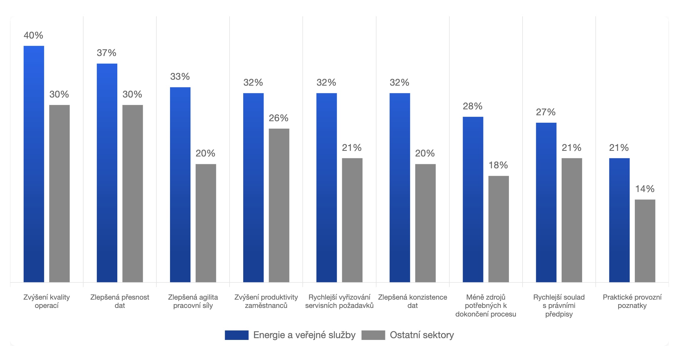 Obr. 1: Podíl vedoucích pracovníků, kteří uvedli, že jejich iniciativy v oblasti inteligentní automatizace přinesly provozní přínosy. Zdroj: Intelligent Automation in Energy and Utilities, Global Automation Research Series: Energy and Utilities