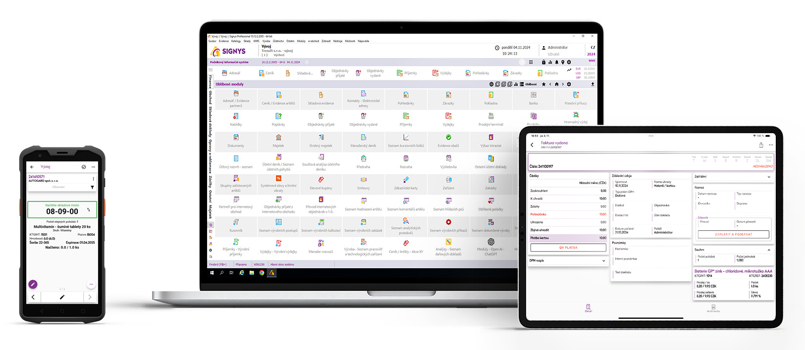 Informační systém Signys představuje komplexní řešení pro řízení firemních procesů, které spojuje přehlednost, efektivitu a flexibilitu. S mobilní aplikací Signys Mobile, logistickým modulem Signys Logistics a e-shopovým rozšířením Signys MIRAShop získává firma jednotný ekosystém, který propojuje všechny části podnikání.