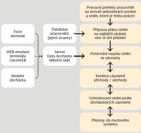 Obr. 1: Procesní návaznost od přípravy plánu směn přes docházku a korekce záznamů až po přenos do mzdového systému.