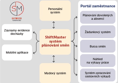 Obr. 2: ShiftMaster jako centrální vrstva propojující plánování směn, evidenci docházky, mzdy a zaměstnanecký portál.