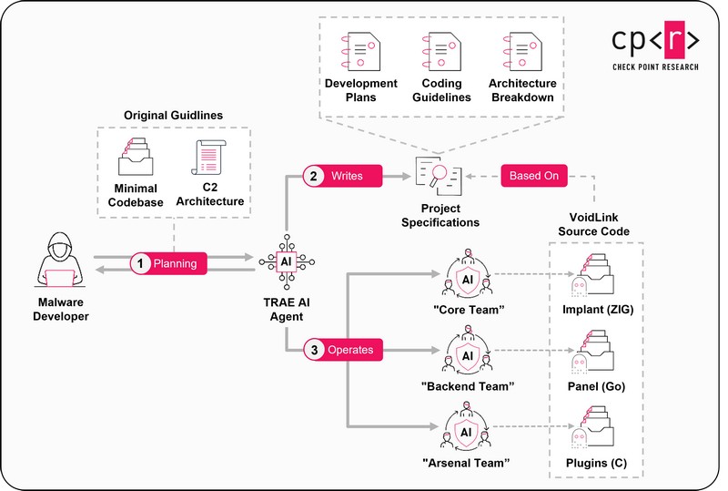Společnosti Check Pointu se díky chybě v zabezpečení podařilo odhalit podrobnosti o projektu VoidLink, ve kterém pravděpodobně jediný hacker s pomocí AI vytvořil za týden kybernetickou zbraň, kterou by profesionální skupina vytvářela měsíce. Výzkumníci získali přístup k části interních materiálů, včetně dokumentace, zdrojového kódu a komponent. VoidLink je prvním zdokumentovaným případem malwaru, kdy pravděpodobně jediný člověk s pomocí AI vytvořil hrozbu, na které by jinak musela pracovat celá profesionální skupina kyberzločinců.