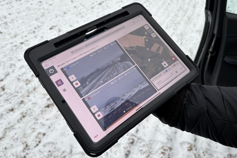 Montér EG.D dohlíží na automatické drony pomocí tabletu. Vidí záběry z kamery, ale i letovou dráhu