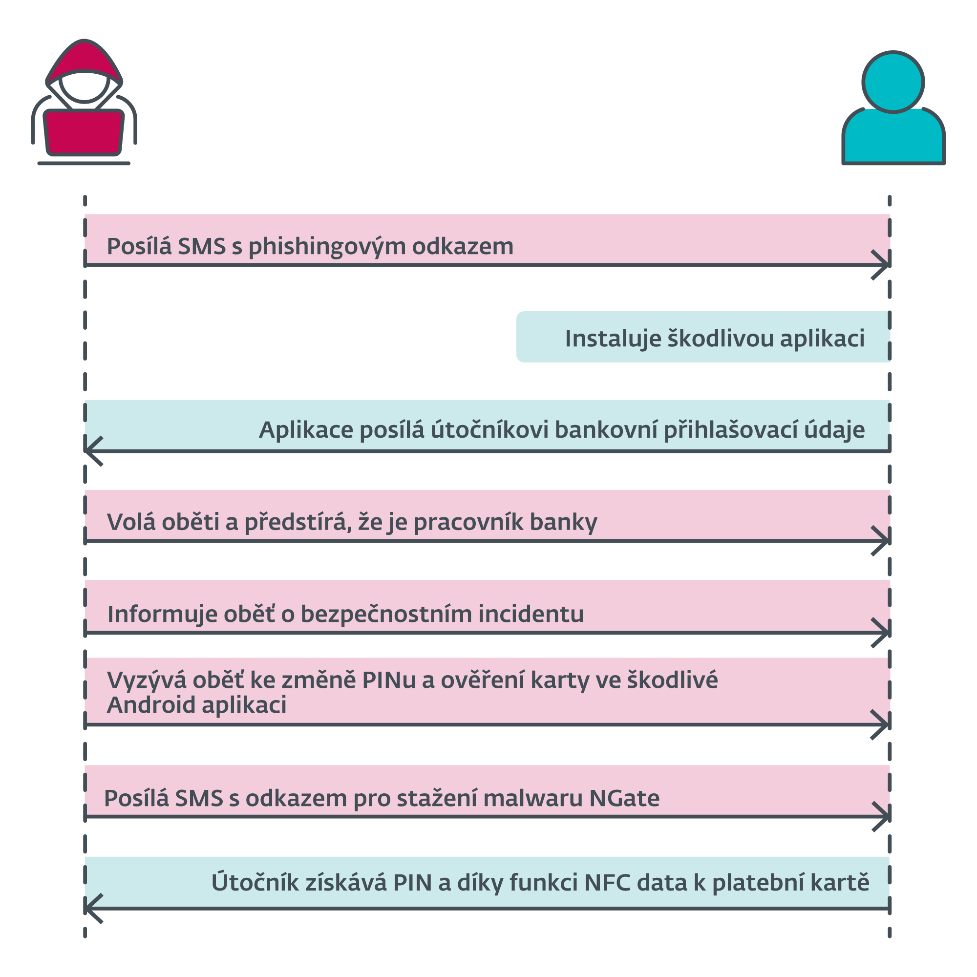 Scénář začíná podvodným hovorem. Oběť je navedená ke stažení aplikace imitující stránky ČNB nebo NBS mimo oficiální obchod s aplikacemi, k aktivování NFC, k přiložení platební karty k mobilu a k zadání PINu. Je tak zřejmé, že obětí útoku se mohou stát pouze lidé, kteří jsou zcela dezorientovaní ve světě financí a digitálních technologií.