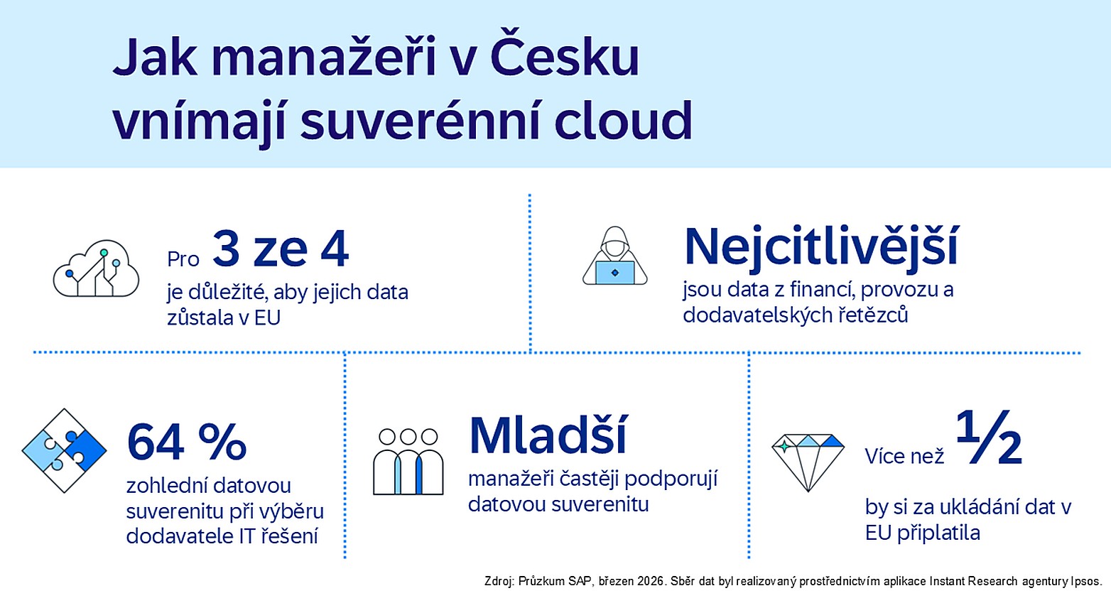 „Firmy v Česku dnes neřeší jen cenu nebo výkon technologií, ale i to, komu svěřují kontrolu nad svými daty, což je zásadní posun. Na významu datové suverenity se přitom shodují manažeři napříč generacemi s tím, že se liší jen v tom, jak velké riziko je kdo ochotný přijmout. Pro nás jako dodavatele to znamená mít mnohem hlubší znalosti a jasné odpovědi na otázky, které dříve vůbec nezaznívaly. Datová suverenita se tak z okrajového tématu stává kritériem, které ovlivňuje rozhodování celé firmy," říká Hana Součková, generální ředitelka SAP ČR.Manažeři nejčastěji preferují model, kdy by v suverénním cloudu měli jen určité kategorie dat, za jejichž uložení by si připlatili. Tento přístup upřednostnilo 36 % dotázaných. Uložení všech dat v suverénním cloudu za vyšší cenu by volilo 15 % manažerů.