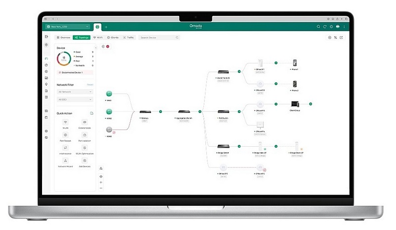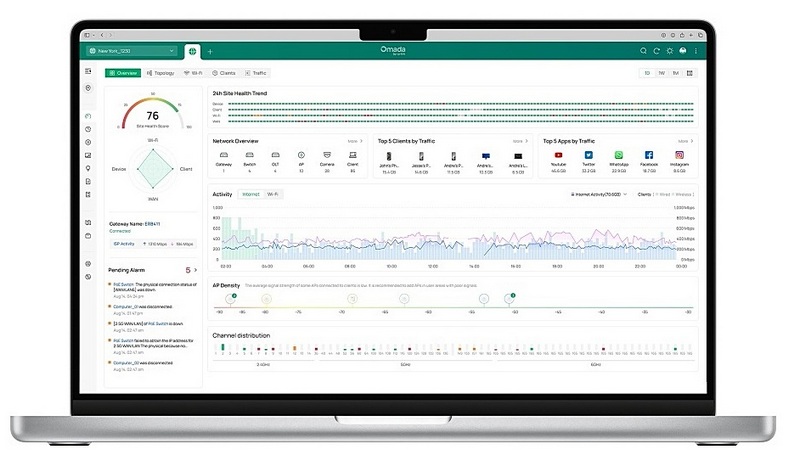 Omada Network V6.0 nabízí intuitivní rozhraní pro efektivnější správu sítě. Aplikace je rozdělena do pěti hlavních sekcí: Přehled, Topologie, Wi-Fi, Klienti a Provoz. Uživatelé tak snadno získají přehled o stavu sítě, vytížení zařízení i chování klientů. Grafické prvky, jako mapa hustoty přístupových bodů nebo teplotní mapa síťového provozu, umožňují rychle identifikovat zatížené oblasti a efektivně plánovat rozšíření infrastruktury.