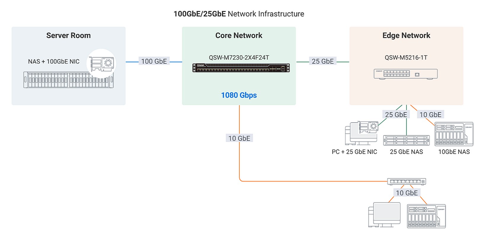 QSW-M7230-2X4F24T kombinuje dva 100GbE QSFP28 porty, čtyři 25GbE SFP28 porty a dvacet čtyři 10GbE RJ45 portů v jedné platformě, což umožňuje 100GbE páteřní propojení, 25GbE uplinky pro servery a NAS systémy a vysokou hustotu 10GbE připojení pro pracovní stanice a agregační switche.