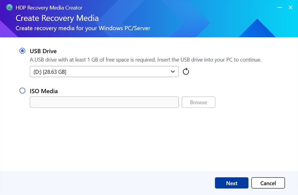Klíčové vlastnosti HDP Recovery Media Creator: