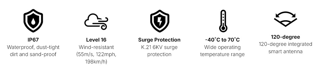 - Mimořádná odolnost: pouzdro přístupového bodu WBE665S má krytí IP 67, které zajišťuje ochranu před vniknutím prachu a vody a současně provozuschopnost při teplotách od -40 °C až do 70 °C. Přístupový bod WBE665S díky tomu dokáže fungovat v mrazicích skladech i pod žhavým sluncem.