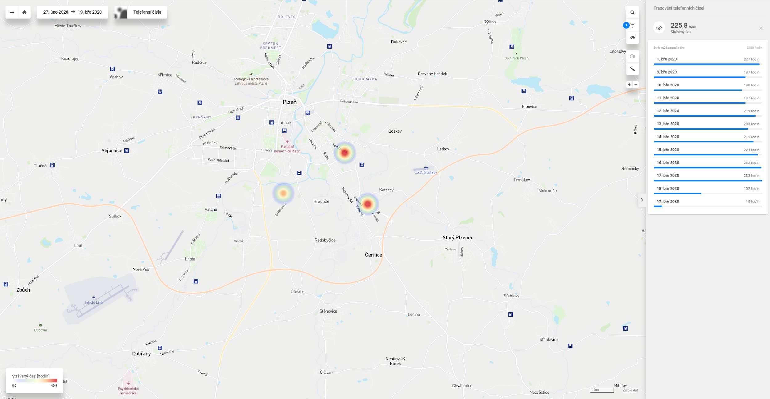 Obr. 1: Ukázky trasování telefonního čísla (pouze demo číslo). Operátor má možnost procházet historii po 6hodinových blocích, ke každé lokalitě je dostupná strávená doba a přesnost polohy