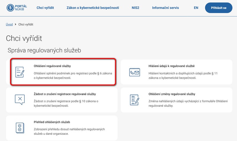 Ohlášení regulované služby probíhá výhradně elektronicky prostřednictvím Portálu Národního úřadu pro kybernetickou a informační bezpečnost (NÚKIB). Ještě před samotným podáním musí organizace ověřit, zda skutečně poskytuje regulovanou službu ve smyslu zákona. Pomoci může přehled kategorií, který úřad zveřejnil na svých webových stránkách. Regulace se týká organizací, které poskytují služby v zákonem vymezených odvětvích, mají významný rozsah či roli, a jejichž narušení by mohlo způsobit závažné dopady na bezpečnost státu, veřejný pořádek nebo na ekonomické a společenské fungování České republiky.